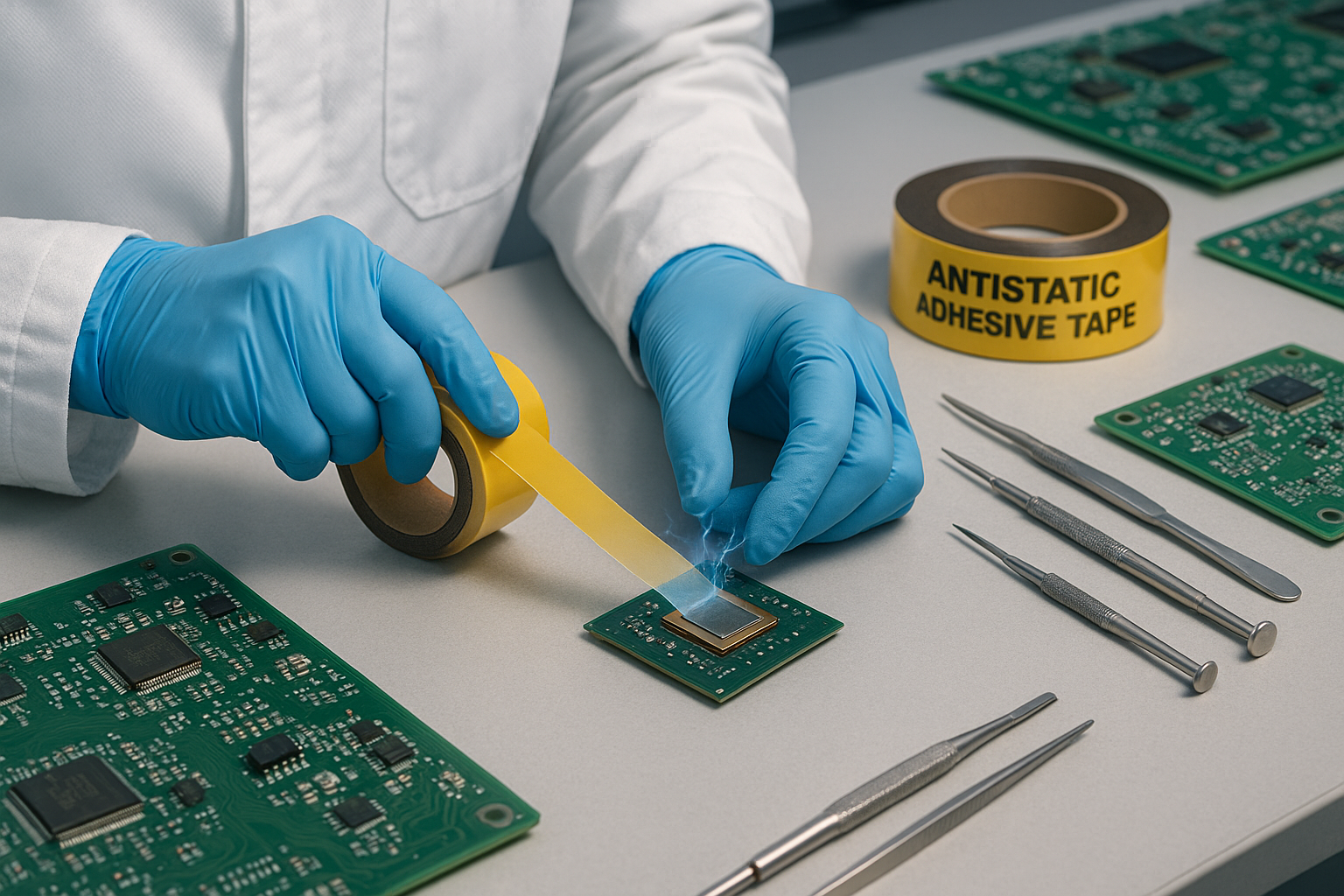 การประกอบแผงวงจรพิมพ์ (PCB) และการจัดการส่วนประกอบเซมิคอนดักเตอร์ถือเป็นกรณีการใช้งานที่มีลำดับความสำคัญสูงสุดสำหรับเทปป้องกันไฟฟ้าสถิต ในการหยิบและวาง เครื่องป้อนเทปและเทปพาหะที่สะสมประจุสามารถป้อนผิดหรือดึงดูดสิ่งปนเปื้อนได้ ในสภาพแวดล้อมแบบรีโฟลว์และการบัดกรีแบบคลื่น อนุภาคที่มีประจุอาจทำให้เกิดข้อบกพร่องในการบัดกรีได้ การใช้เทปที่มีการควบคุมความต้านทานพื้นผิวจะช่วยรักษาหน้าต่างกระบวนการที่ปลอดภัยจาก ESD และลดความล้มเหลวในการประกอบที่เกิดจากเหตุการณ์ไฟฟ้าสถิต